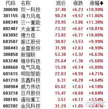风电设备板块涨幅居前,双一科技20CM涨停,海力风电、三(san)一重能、大(da)金重工(gong)、德(de)力佳、振江股份等跟(gen)涨。
