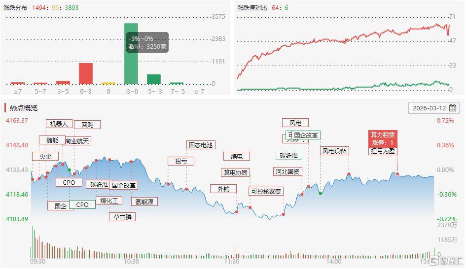 3月(yue)12日(ri),A股主(zhu)要指数集体下跌,沪指跌0.1%报4129点,深证(zheng)成指跌0.63%,创业板指跌0.96%。沪深两(liang)市成交额2.44万亿,较上一个交易日(ri)缩量665亿,近3900股下跌。