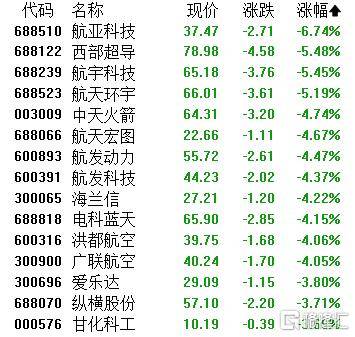军工(gong)装备下跌,航(hang)亚科技跌超6%,西部超导(dao)、航(hang)宇科技、航(hang)天(tian)环宇、中天(tian)火箭、航(hang)天(tian)宏图、航(hang)发动力、航(hang)发科技等跟(gen)跌。