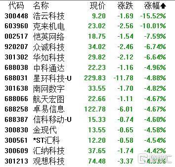 AI应用板块普跌,浩云科技跌超15%,克来机电、恺英网络、众诚科技、华如科技、中科通达(da)等跟(gen)跌。