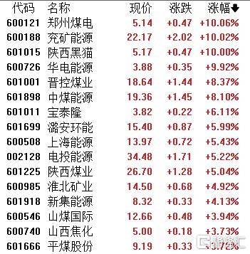 煤炭股集体走强,郑(zheng)州煤电、兖(yan)矿能源、陕西黑猫、华电能源涨停,晋(jin)控煤业、中煤能源、宝泰(tai)隆、潞安环能等跟(gen)涨。